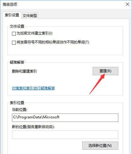 3、在高級選項窗口中有“重建”按鈕,點擊即可刪除和重建索引。