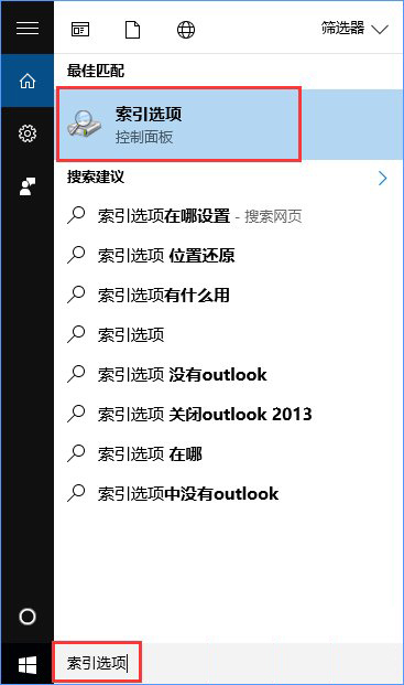 1、在Cortana搜索框中輸入“索引選項”,并點擊打開“索引選項(控制面板)”;