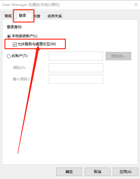 3、 之后,切換至“登陸”選項頁面,勾選“允許服務與桌面交互(W)”并點擊“確定”。