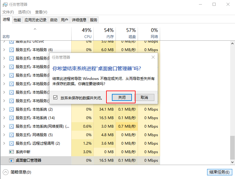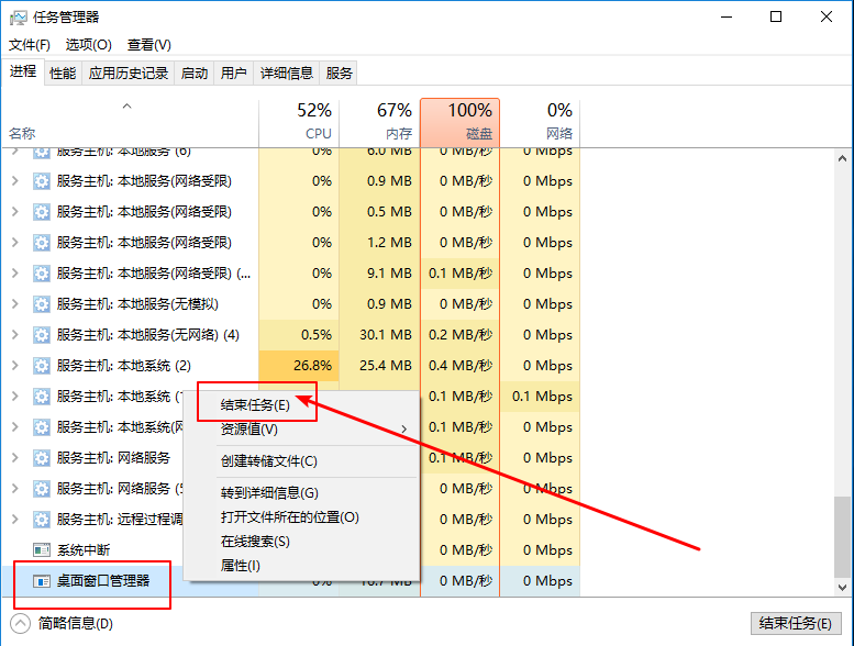 2、然后,在任務管理器頁面中,找到“桌面窗口管理器”,右鍵“桌面窗口管理器”,點擊“結束任務”。
