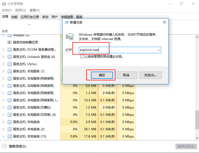 4、彈出新建任務頁面時,輸入“explorer.exe”并點擊“確定”即可。